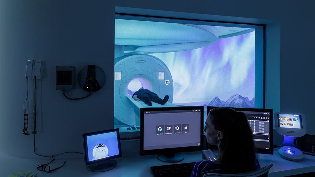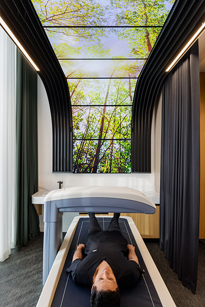 A seamless technology ecosystem keeps the space running smoothly and personalized to members’ needs, letting them control privacy, light, sound, climate, and one-of-a-kind immersive content, all from one on simple-to-use touch interface. To reimagine the comprehensive screening, members are welcomed with a four-panel visualization hub that clearly communicates their diagnostics and data. Immersive environments reduce anxiety endemic to imaging procedures: the MRI room features a floor-to-ceiling projection of nature and the ultrasound features a curved LED screen for ergonomic real-time viewing or natural imagery for relaxation.