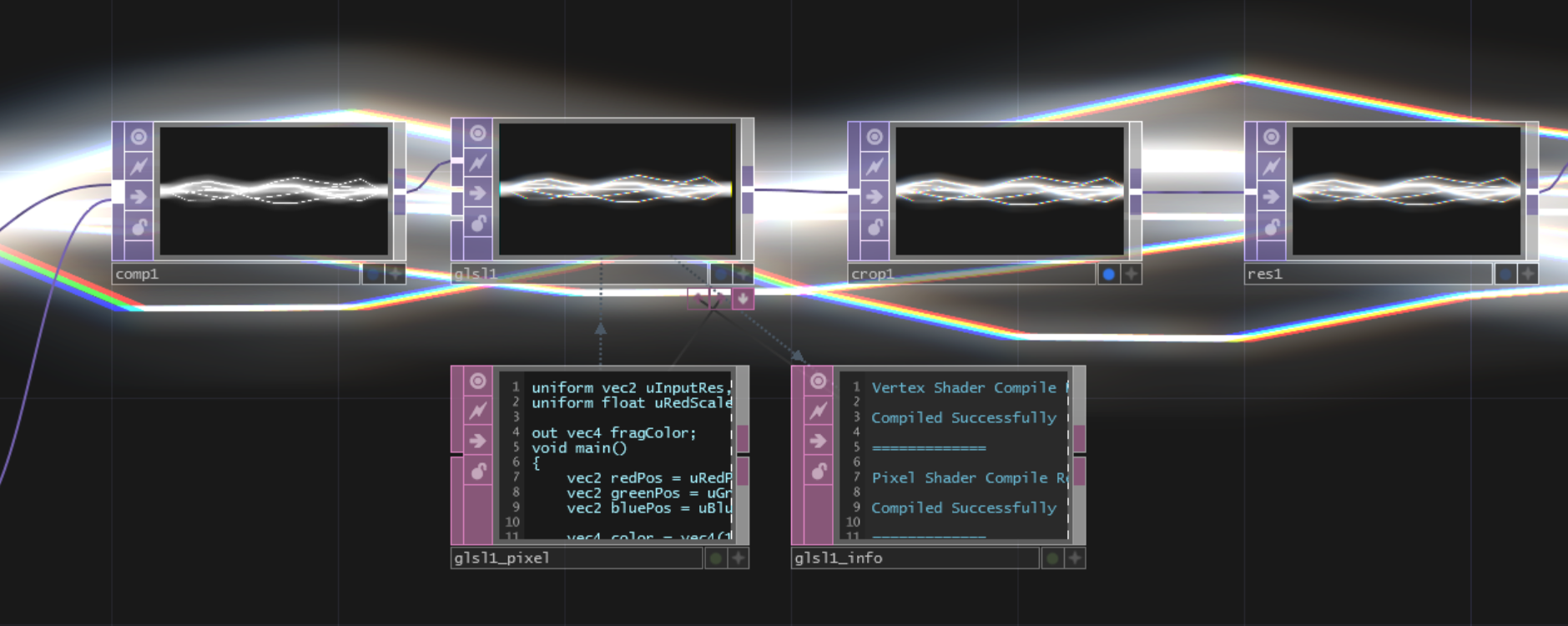 Once I had a noise curve with pinned edges, I drew a series of SOP curves with those lines, and rendered them into TOPs. By rendering them at a few thicknesses, I added blur and overlay effects to make the lines seem to glow.