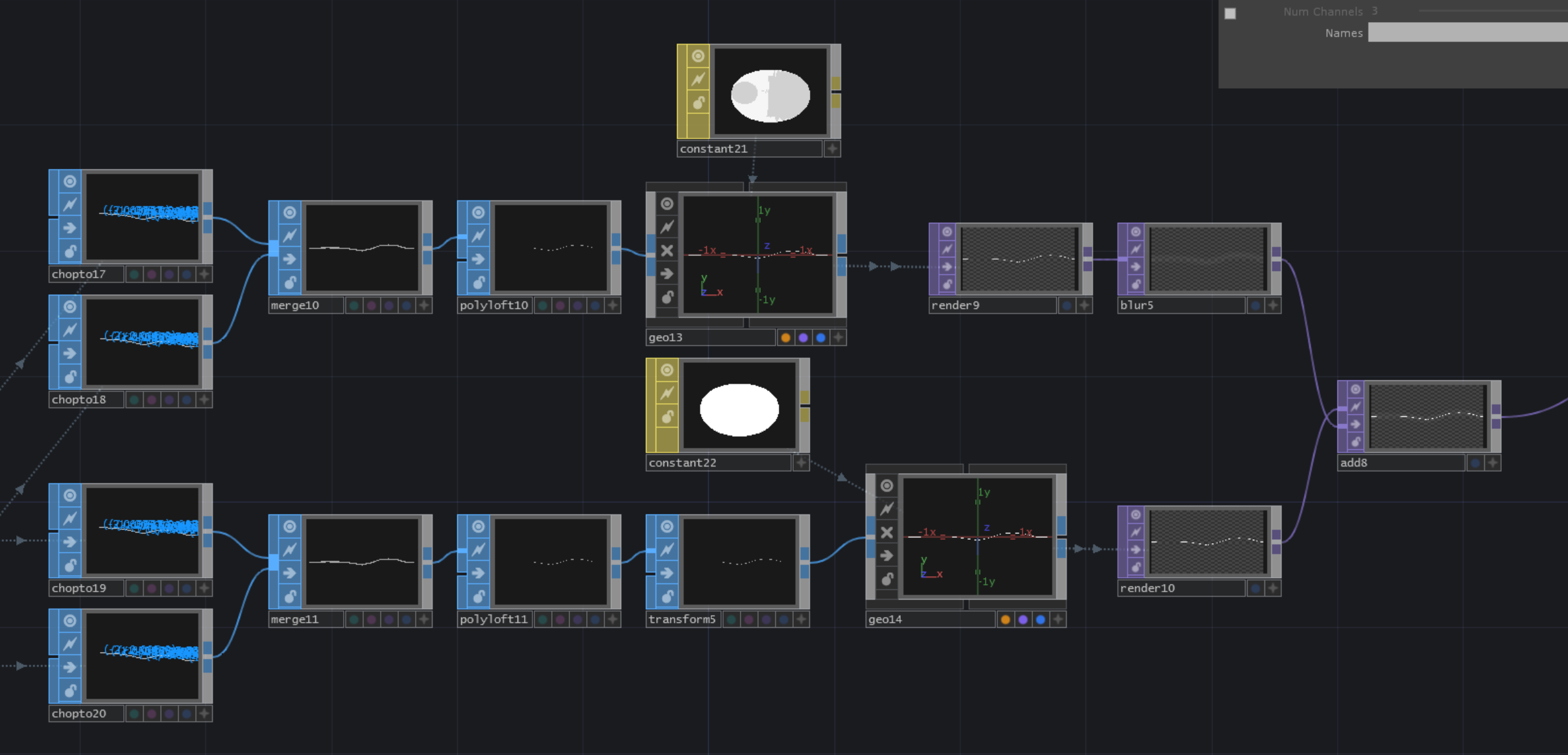 The first problem to solve was how to manage CHOPs to create noise curves with pinned edges, and good feeling movement.